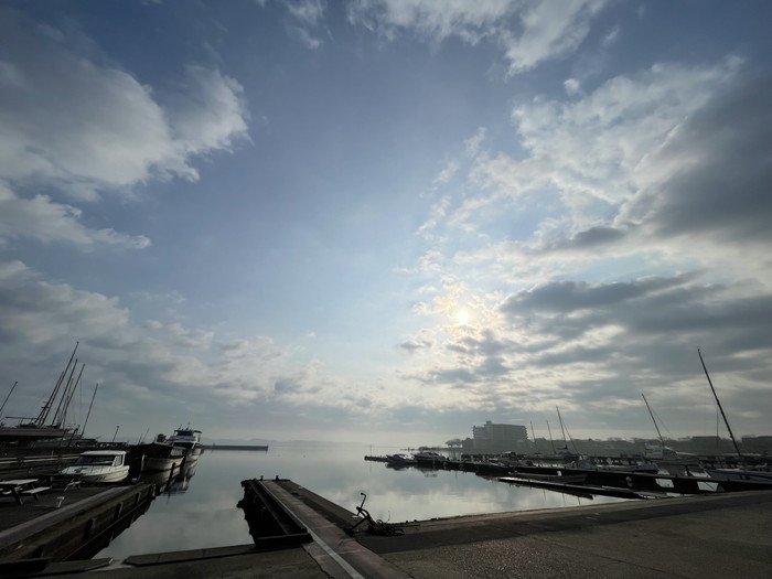 今日の霞! 暖かい朝でした! マンションのフローリングを裸足で歩いていても平気! マッタク冷たくない! 早く暖かくならないか!適度に!? 裸族?裸足? ビーサン好きな爺はイイ気分です! マダマダ水位はイイ気分ではありません。 午後からは東系の風が強く体感温度は寒くなりました。 予定の打ち合わせに行くと・・・ マリーナからSの仕事です!? オイル漏れ! 凍った? 使用するものが!? 自分のモノではない!?不特定多数案件!? 維持管理が凄く難しい。 知らんけど。